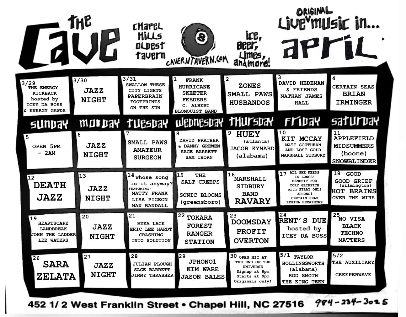 April 1 @ 12:00 am - May 6 @ 12:00 am APRIL CALENDAR The Cave NC, United States Suggested Donation $10