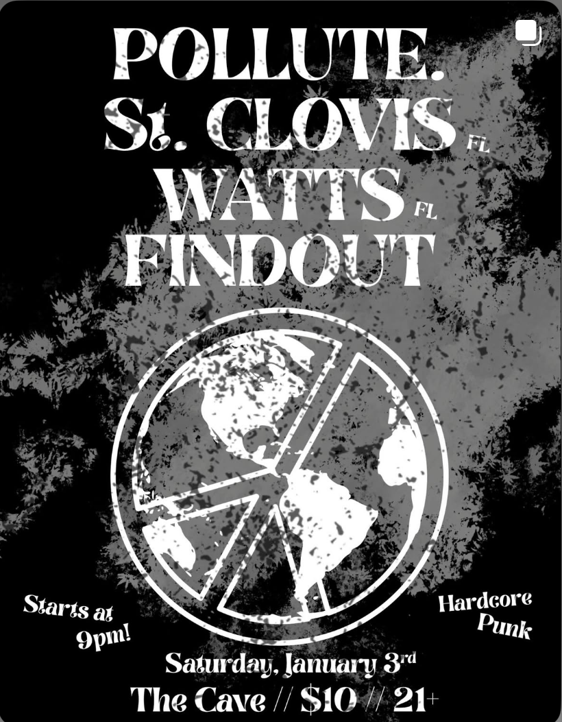 January 3 @ 9:00 pm Pollute | St. Clovis | Watts | Find Out The Cave NC, United States Suggested Donation $10 PolluteSt. ClovisWattsFind Out