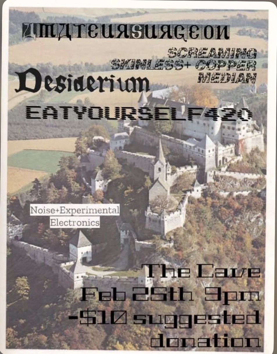 February 25 @ 9:00 pm Desiderium | Amateur Surgeon | Eatyourself420 The Cave NC, United States Suggested Donation $10 DesideriumAmateur SurgeonEatyourself420