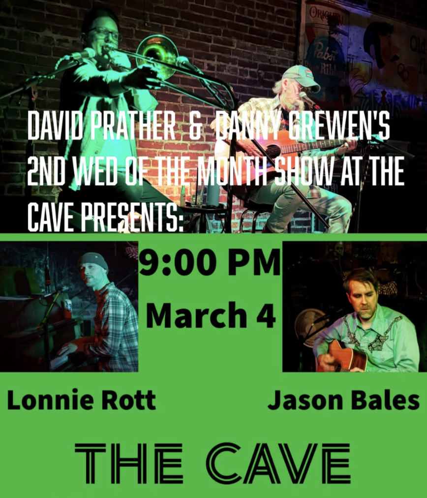 March 4 @ 9:00 pm David Prather & Danny Grewen | Lonnie Rott | Jason Bales The Cave NC, United States Suggested Donation $10 FeaturingDavid PratherDanny GrewenLonnie RottJason Bales