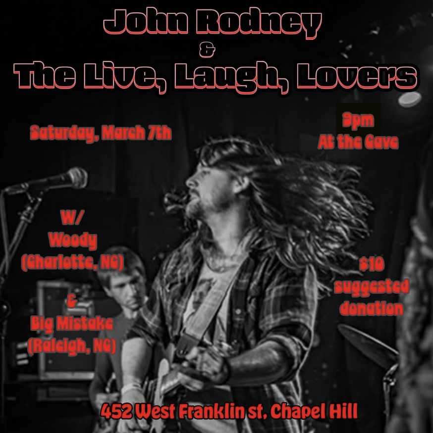 March 7 @ 9:00 pm John Rodney & The Live, Laugh, Lovers | Woody | Big Mistake The Cave NC, United States Suggested Donation $10 John Rodney & The Live, Laugh, LoversWoodyBig Mistake