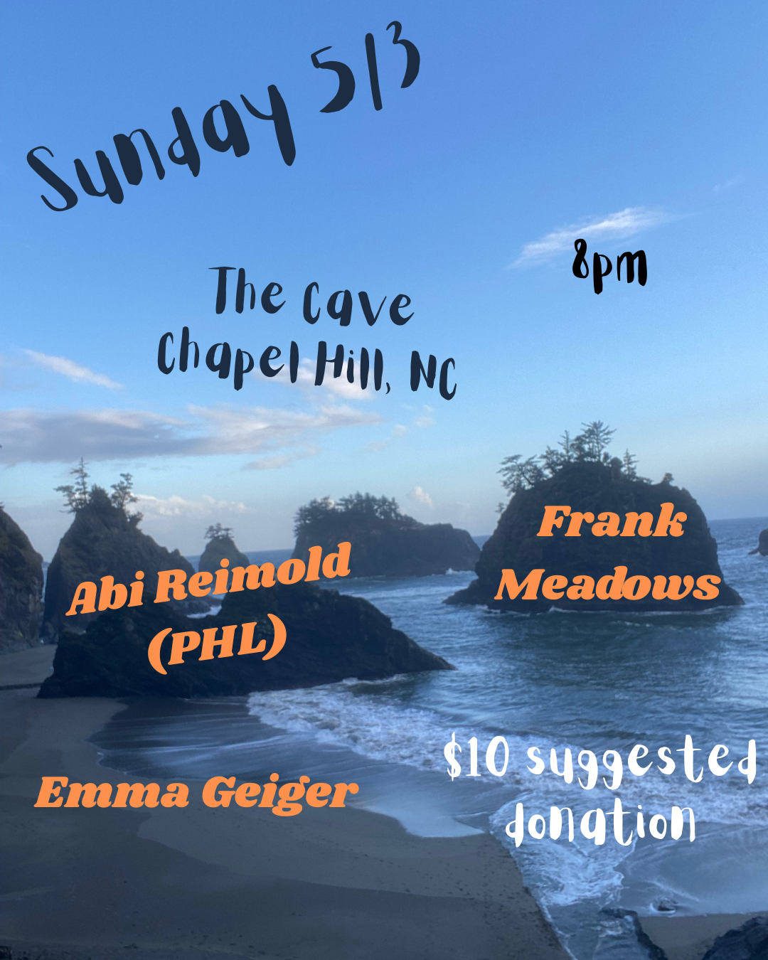 May 3 @ 8:00 pm Emma Geiger | Frank Meadows | Abi Reimold The Cave NC, United States Suggested Donation $10 Emma GeigerFrank MeadowsAbi Reimold