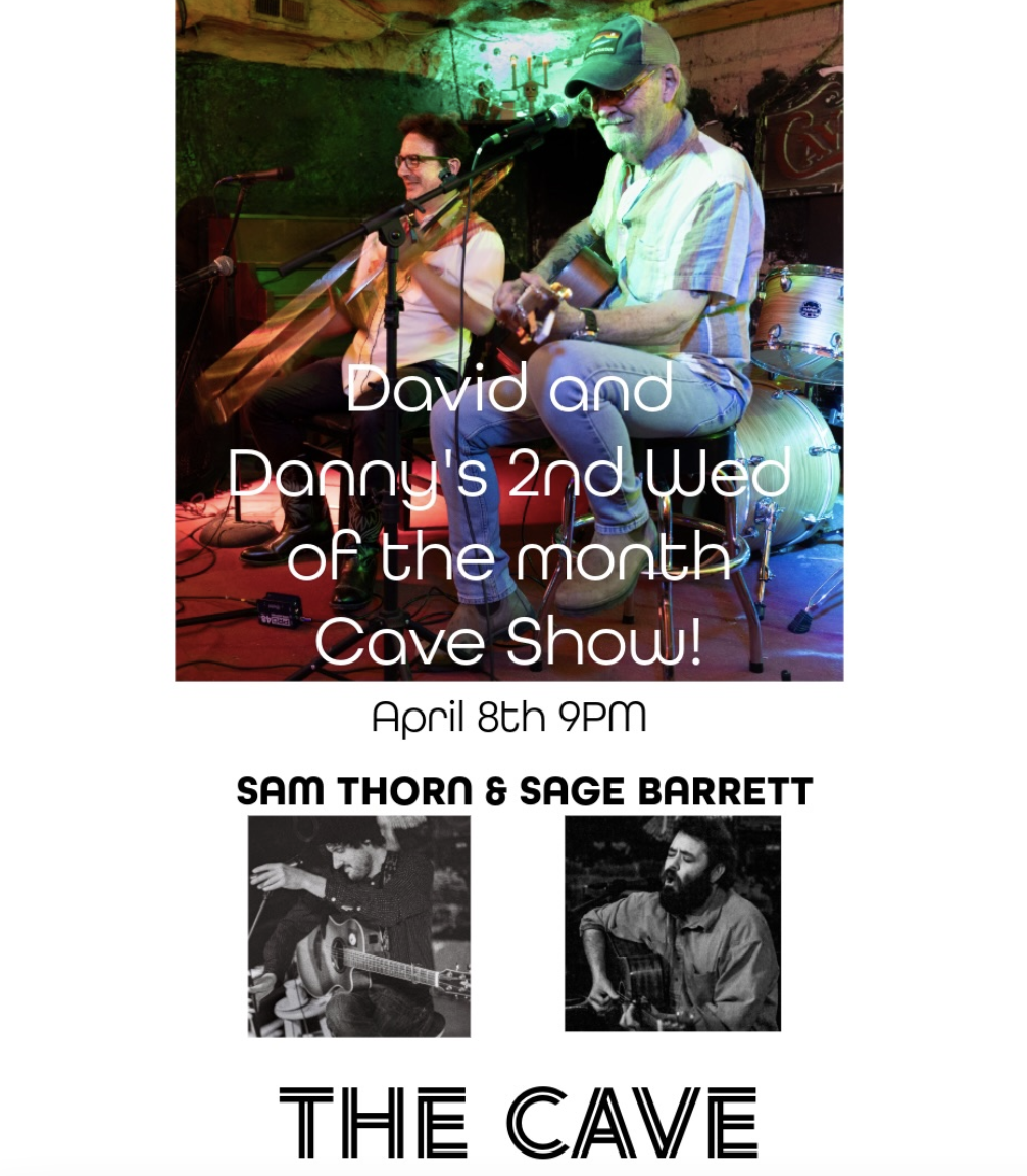 April 8 @ 9:00 pm David Prather & Danny Grewen | Sage Barrett | Sam Thorn The Cave NC, United States Suggested Donation $10 David PratherDanny GrewenSage BarrettSam Thorn