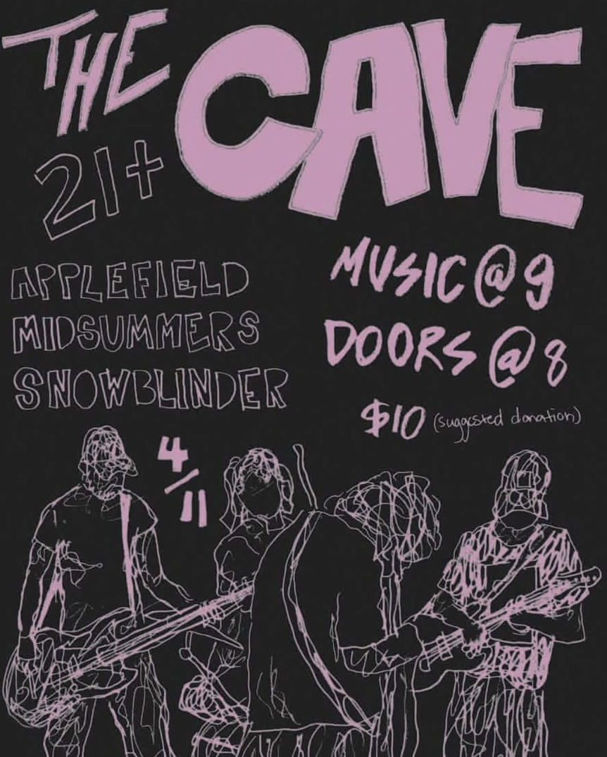 April 11 @ 9:00 pm Applefield | Midsummers | Snowblinder The Cave NC, United States Suggested Donation $10 ApplefieldMidsummersSnowblinder