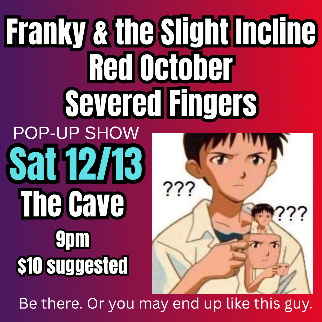 December 13 @ 9:00 pm Franky & The Slight Incline | Red October | Severed Fingers The Cave NC, United States Suggested Donation $10 Franky & The Slight InclineRed OctoberSevered Fingers